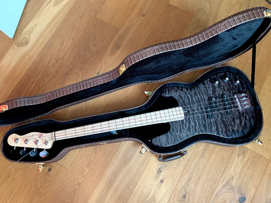 I experimented with inlayed fingerboards before with the beat-up tele project, and revisited it here. An exceptional piece of birdseye maple fretboard is inlayed in a flame maple neck with a delicate black veneer in between. With the white mother of pearl inlays, it creates pure luxury in looks... But with this set of Aguilar pickups it also has the sound to match! I felt it was necessary to get a snake skin case for this instrument, I'm sure you'll understand. (No snakes were harmed as far as I know)